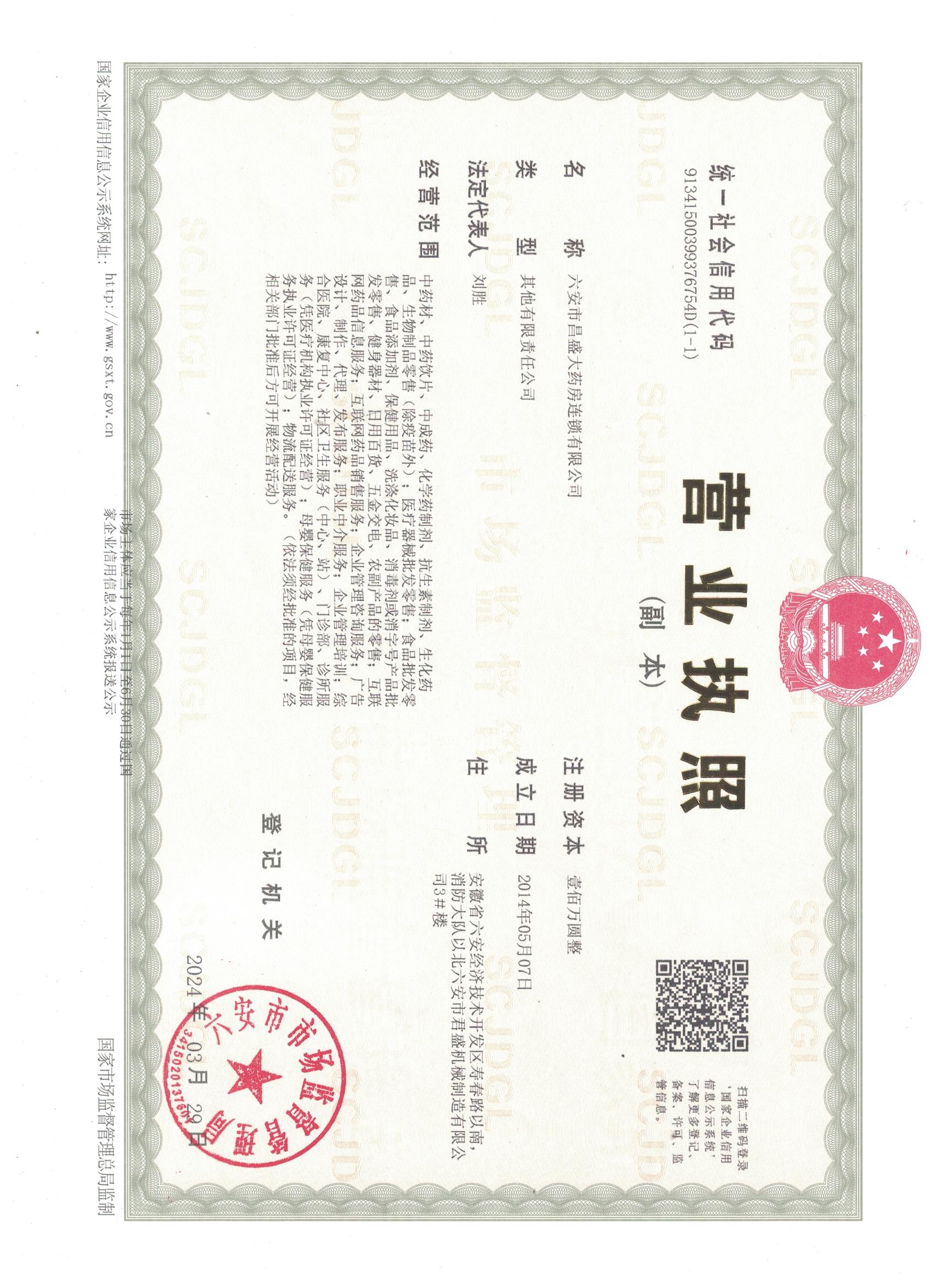 六安市昌盛大藥房連鎖有限公司 互聯(lián)網(wǎng)藥品資格證書(shū)編號:(皖)-非經(jīng)營(yíng)性-2019-0070